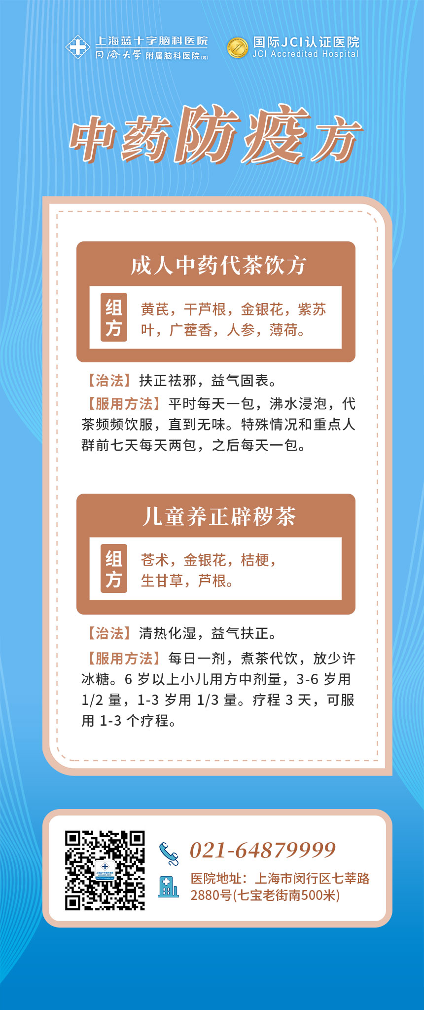 为进一步发挥中医药在应对新型冠状病毒中的特色和优势,保护群众的生命安全和身体健康,蓝十字脑科医院中医科在《新冠病毒感染者居家中医药干预指引》等权威中医药诊疗方案基础上,按照中医学理论,结合季节和人群特点,特推出普遍适用、方便易用的“中药防疫方”,积极为广大群众保驾护航。