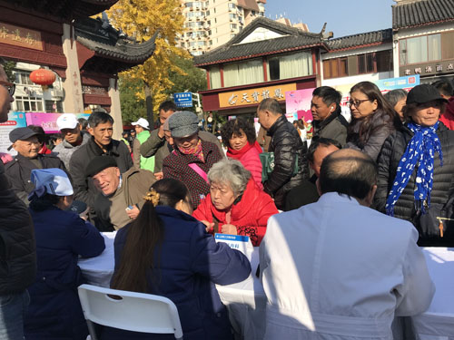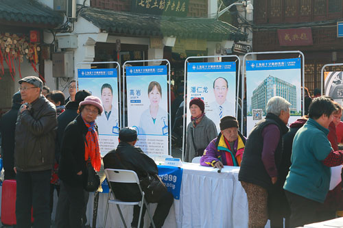 昨天下午1点半刚过,七宝老街钟楼广场,各家志愿者服务队都在忙碌地进行服务台布展工作。在蓝十字脑科医院的咨询服务台前,已经有5、6位居民在排队等候了。“这么冷的天,年纪大了行动不便,医院能主动将服务送到家门口,太好了!”一位老奶奶说道。