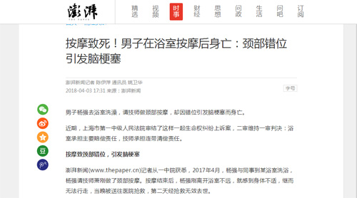 2017年4月,男子杨某与同事到某浴室洗浴,杨某请技师萧某做了颈部按摩。按摩结束,杨某刚走出浴室没几步,就感到身体不适,继而无法行走,当即送医急救,第二天经抢救无效去世。经司法鉴定,杨某系由不当按摩导致颈椎错位,引发脑梗塞而身亡。