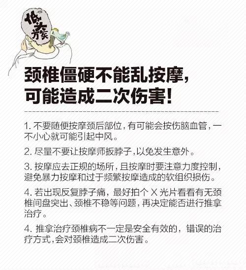 5.接受颈部按摩后,一旦出现持续的头颈部疼痛、视物感觉异常等情况,一定要尽早寻求神经科、脑血管病专业医生的帮助,及时获得规范的检查和治疗。