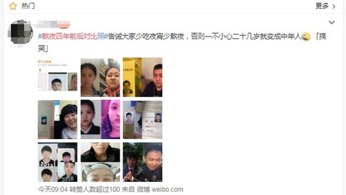 此后,这个帖子迅速在网友中间引起共鸣,大家纷纷晒出自己熬夜吃宵夜几年后的颜值对比,一个个堪称“毁容”现场。