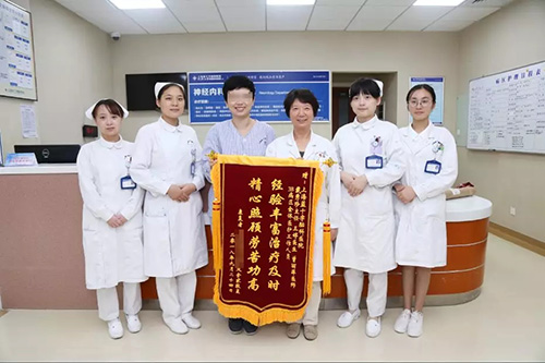 临出院时,性格爽朗的江女士一路小跑着从病房出来,将精心定制的锦旗送到戴秀珍教授手中,对戴教授团队的精准诊断和专业治疗护理工作表达诚挚谢意。