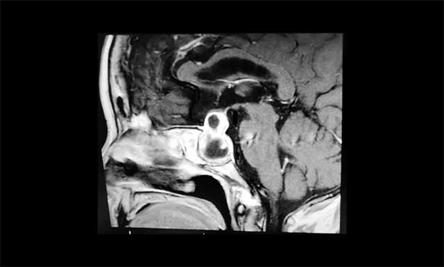 李士其教授分析:肿瘤主体位于鞍内、鞍上、鞍旁发展,呈“哑铃”形。从影像学资料上看,发现瘤体已经非常大了,属于巨大垂体瘤。瘤体占据鞍区,并向蝶窦和鞍上发展,侵袭双侧海绵窦,视神经、视交叉受压,所以需要马上进行手术切除,解除压迫。若任其发展,将来有失明的风险。
