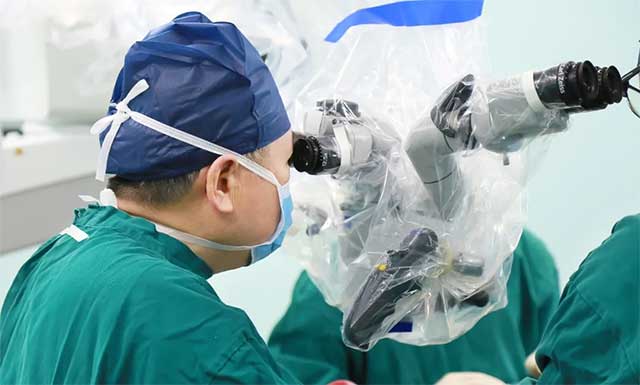 在制定详细手术方案并充分完善术前准备后,6月7日,李士其教授在吴治群博士、黄秀夫医生协助下经蝶窦入路成功为患者进行了手术。术中,在蔡司显微镜(双荧光)下,见淡红色肿物,质软,其外有包膜包裹,肿瘤下部部分呈囊性,其内有黄绿色液体。李士其教授在充分保护好海绵窦、颈内动脉、视神经等结构前提下,在错综复杂的神经血管狭窄间隙中,逐步分块切除肿物,仔细刮除肿瘤,最终将肿瘤顺利切除。