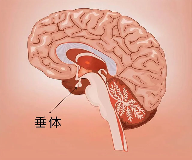 垂体,位于丘脑下部的腹侧,为一卵圆形小体。是身体内最复杂的内分泌腺,所产生的激素不但与身体骨骼和软组织的生长有关,且可影响内分泌腺的活动,是人体内较大的内分泌调控中枢。