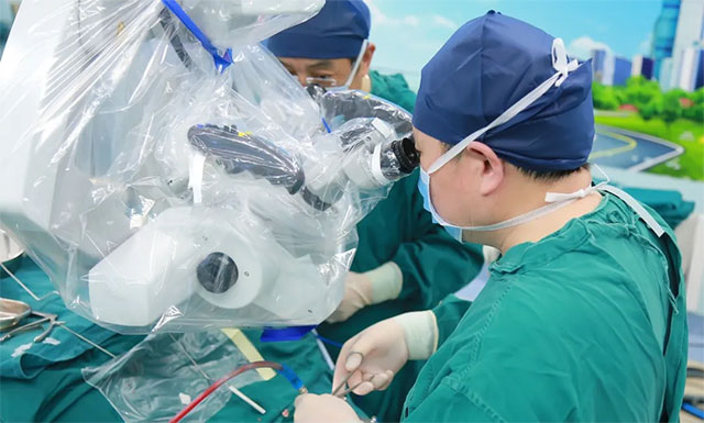 在制定详细手术方案并充分完善术前准备后,7月6日,李士其教授在吴治群博士、黄秀夫医生协助下经蝶窦入路成功为患者进行了手术。李士其教授在充分保护好海绵窦、颈内动脉、视神经等结构前提下,在错综复杂的神经血管狭窄间隙中,逐步分块切除肿物,仔细刮除肿瘤,最终将肿瘤顺利切除。