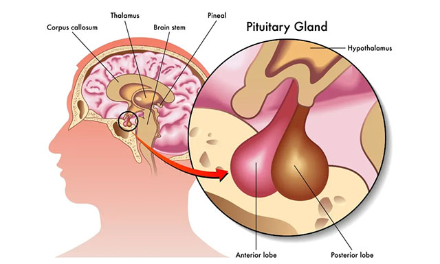 脑下垂体中的各种内分泌细胞可产生相应的内分泌细胞腺瘤,引起内分泌功能紊乱。在早期微腺瘤阶段即可出现内分泌功能亢进征象,随着腺瘤的长大和发展,可压迫、侵蚀垂体组织及其垂体、蝶鞍周围结构,产生内分泌功能下降症状。