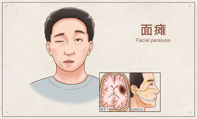 面瘫急性起病,主要表现为患侧面部表情肌瘫痪,口眼歪斜,额纹消失,不能皱额蹙眉,眼裂不能闭合或者闭合不全。根据损伤的部位不同分为中枢性面瘫和周围性面瘫,中枢性病变位于面神经核以上至大脑皮层之间的皮质延髓束,通常由脑血管病等引起,还可以伴有语言障碍、偏瘫、偏身感觉障碍等症状。周围性面瘫又称面神经炎或贝尔麻痹,是最常见的面神经疾病,约占面瘫的70%以上,可能因茎乳孔内面神经非特异性炎症导致周围性面瘫,一般预后良好。