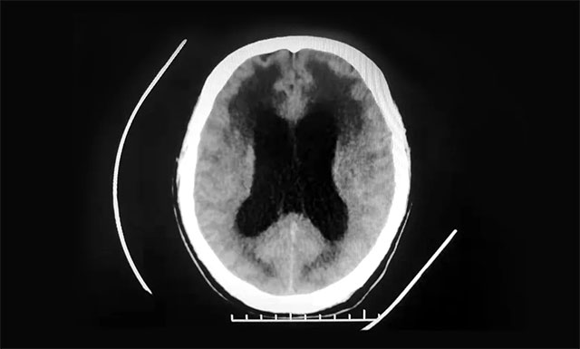 医院神经外科6A病区侯增欣主任团队结合患者既往病史,有针对性地对患者开展了系统的检查,余先生的定向力、计算力和记忆力均有所下降,精神状态差,意识障碍较为明显。行CT检查可见,患者脑干体积缩小,脑室系统中度扩张,充盈的脑脊液已部分渗入了脑组织,形成间质性脑水肿,情况比较严重。