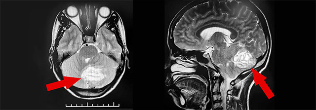 ▲ MRI检查显示,该小脑肿瘤有明显的“虎纹征”