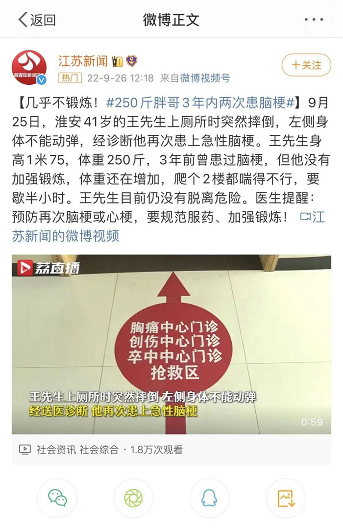 前段时间,一则250斤胖哥3年内两次患脑梗的新闻报道,引发网友广泛讨论。江苏新闻去年9月26日报道,9月25日,淮安41岁的王先生上厕所时突然摔倒,左侧身体不能动弹,经诊断他再次患上急性脑梗。原来,王先生身高1米75,体重却高达250斤,3年前曾患过脑梗,但他没有加强锻炼,体重还在增加,最终脑梗又一次“不期而至”。