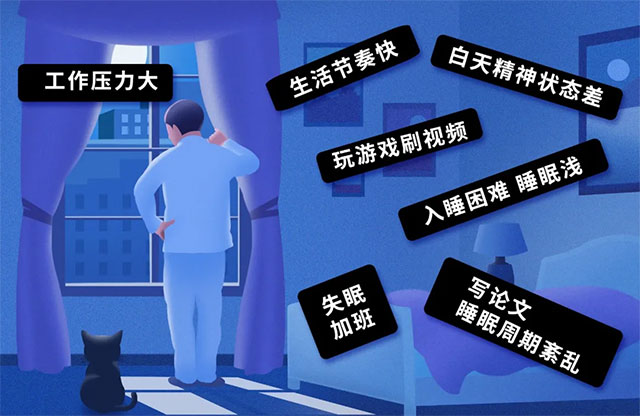 随着生活节奏的加快、工作压力的增大,很多人的不良生活方式呈多样化,因加班、玩游戏、刷视频、写论文等而熬夜的现象随处可见,由此造成很多人作息时间不规律,入睡时间忽早忽晚,睡眠周期紊乱,还出现了不同程度的睡眠问题,如入睡困难、睡眠浅、白天精神状态差、失眠等。根据最新流行病学调查显示,我国有各类睡眠障碍者约占人群的38%,高于世界27%的比例。约90%的人在夜间喜欢边看手机边睡,认为看困了就自然入睡。事实上,睡前接受各种信息,容易引发睡眠拖延,从而造成入睡困难或者夜间频繁醒来。