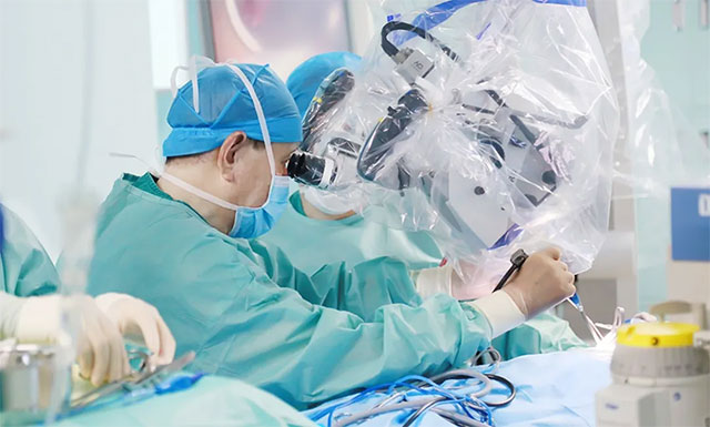 ▲ 沈教授在显微镜下为患者切除肿瘤