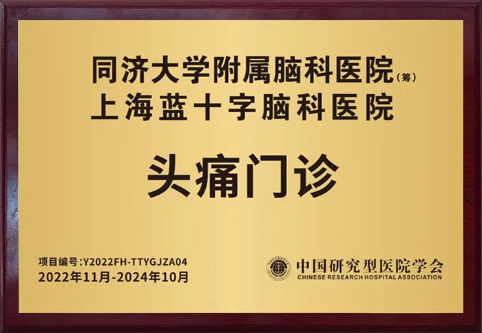 上海蓝十字脑科医院已开设头痛专病门诊多年,每周定期开诊,形成了以中西医结合方法辨证施治、诊治各种类型头痛的专科特色,强调头痛治疗的系统化、规范化和科学化。经中国研究型医院学会头痛与感觉障碍专业委员会审核评估,医院头痛诊疗综合实力达到头痛门诊建设标准,于2022年11月获批设立“头痛门诊”,是学会批准设立的上海市第二个“头痛门诊”。