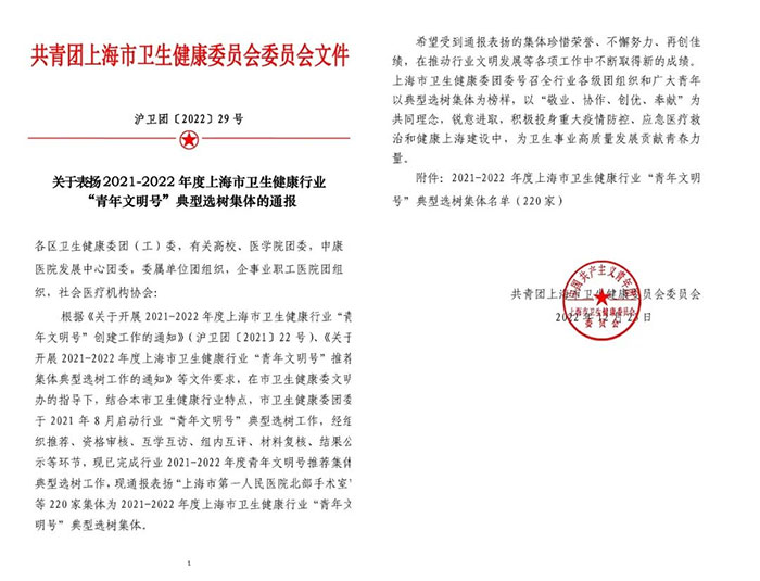 近日,共青团上海市卫生健康委员会委员会发布了《关于表扬2021-2022年度上海市卫生健康行业“青年文明号”典型选树集体的通报》,上海蓝十字脑科医院手术麻醉科光荣登榜,获评“青年文明号”典型选树集体。这是继神经内科获评“2019—2020年度青年文明号”后,又一集体获此殊荣,为医院精神文明建设工作再添荣光。