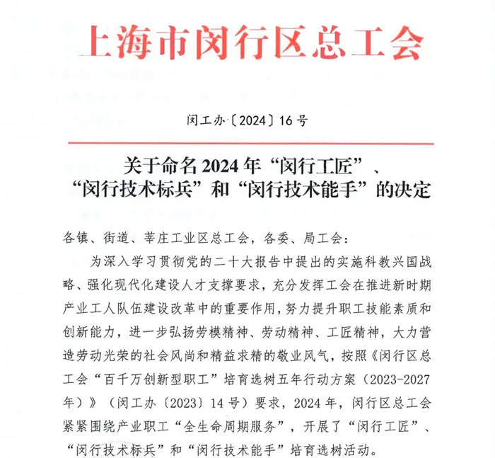 为深入学习贯彻党的二十大报告中提出的实施科教兴国战略、强化现代化建设人才支撑要求,充分发挥工会在推进新时期产业工人队伍建设改革中的重要作用,努力提升职工技能素质和创新能力,进一步弘扬劳模精神、劳动精神、工匠精神,大力营造劳动光荣的社会风尚和精益求精的敬业风气,按照《闵行区总工会“百千万创新型职工”培育选树五年行动方案(2023-2027年)》(闵工办(2023)14号)要求,2024年,闵行区总工会紧紧围绕产业职工“全生命周期服务”,开展了“闵行工匠”“闵行技术标兵”和“闵行技术能手”培育选树活动。