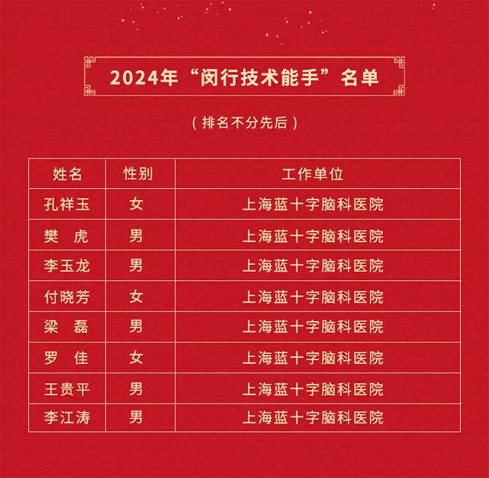 近日,闵行区总工会公布了2024年“闵行工匠”、“闵行技术标兵”和“闵行技术能手”名单,上海蓝十字脑科医院【同济大学附属上海蓝十字脑科医院(筹)】孔祥玉、樊虎、李玉龙、付晓芳、梁磊、罗佳、王贵平、李江涛等9名职工入选“闵行技术能手”。