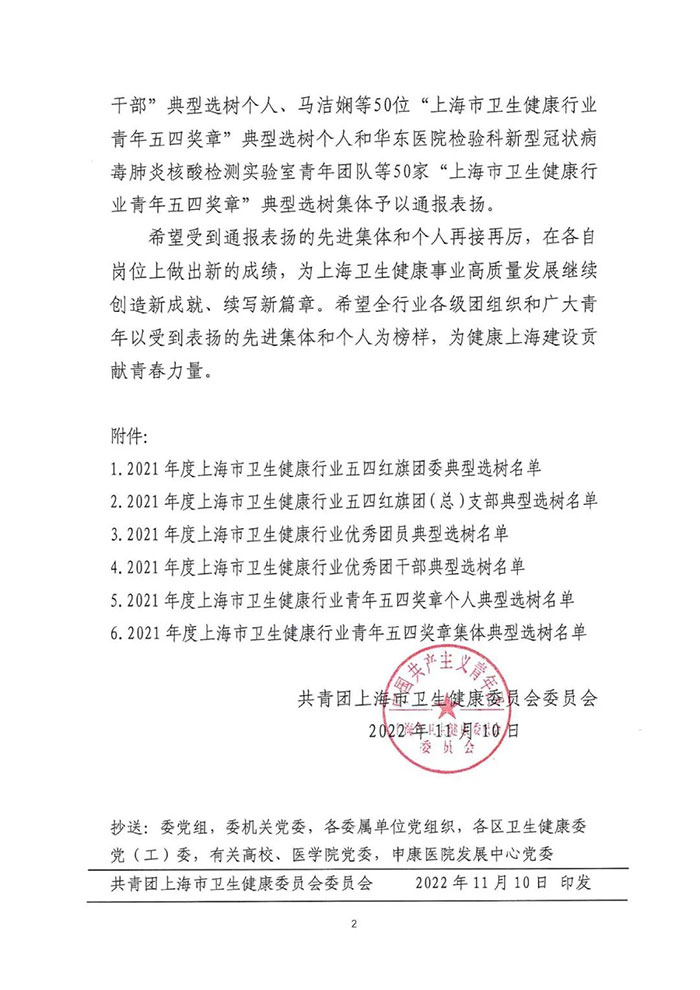 11月10日,市卫生健康委团委通报表扬2021年度上海市卫生健康行业五四红旗团组织、优秀团员、优秀团干部、青年五四奖章典型选树个人和集体。上海蓝十字脑科医院团支部荣获“2021年度上海市卫生健康行业五四红旗团(总)支部”称号。