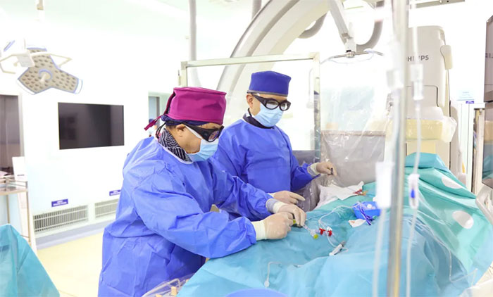 ▲ 4F脑血管病科主任席刚明教授、4A脑血管病一科副主任王贵平博士在开展介入手术