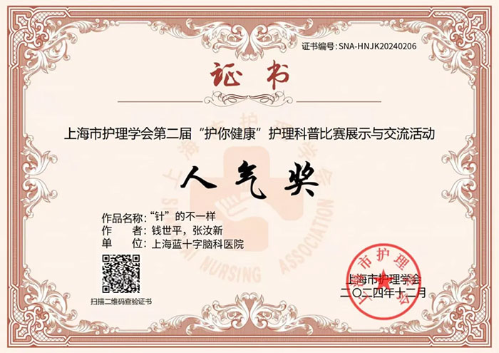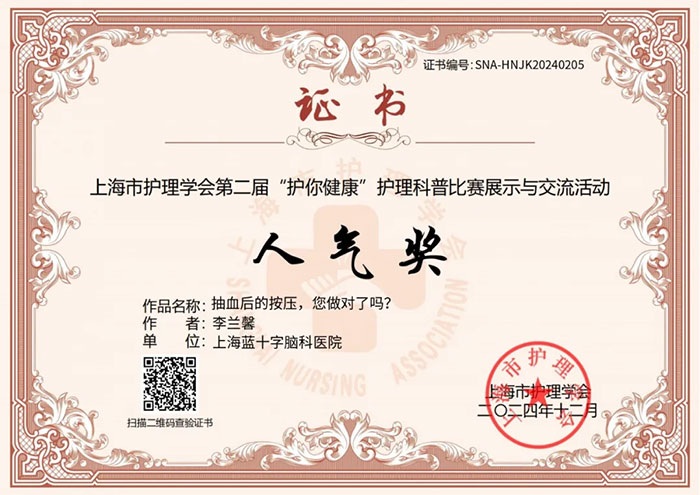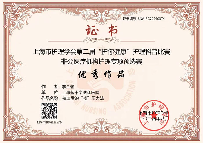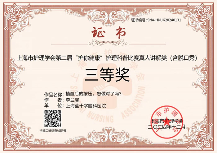 经过激烈角逐,上海蓝十字脑科医院【同济大学附属上海蓝十字脑科医院(筹)】精心选送的参赛作品《抽血后的按压,您做对了吗?》(作者:李兰馨)荣获上海市护理学会第二届“护你健康”护理科普比赛真人讲解类(含脱口秀)三等奖。