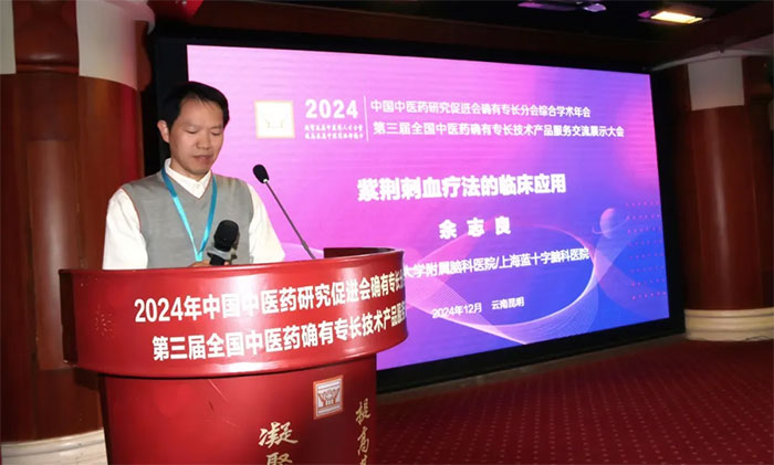 上海蓝十字脑科医院5B病区主任余志良博士受邀参加此次大会,并以精研首创的“紫荆刺血疗法的临床应用”为主题,上台交流发言。