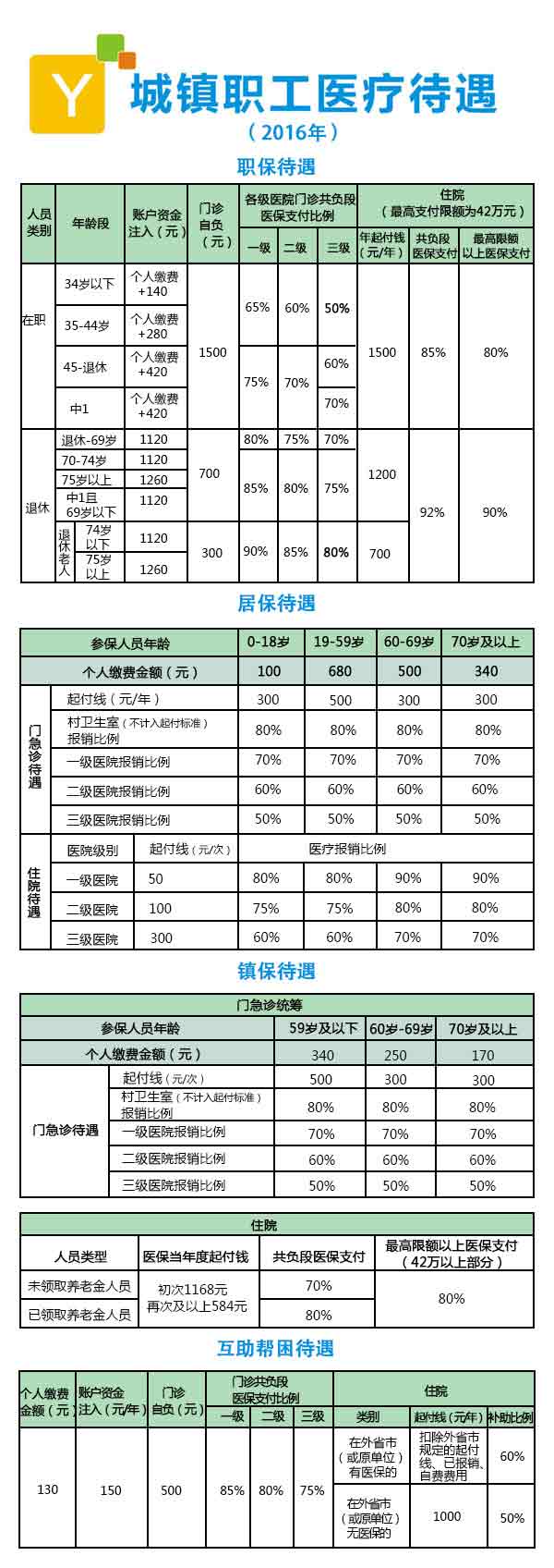不同的参保险种有不同的医保待遇,医保管理部门会适时进行调整,目前各类医保待遇如下表: