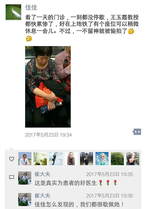 5月23日,罗佳忍不住发了一条朋友圈:看了一天的门诊,一刻都没有停歇,王玉霞累惨了......“那天如往常一样,病人特别多,她忙到7点多,回家在地铁上累睡着了。”罗佳至今印象深刻。“她住在静安寺,每次来出诊,要花费一个多小时,但她总是提前半个小时到,赶在出门诊前去病房看看门诊收过的病人,门诊结束后再去一次,雷打不动。”