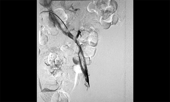 12月15日,席刚明教授在王贵平博士及介入团队协助下顺利行将一个形似伞状的人工滤器经患者右侧股静脉穿刺迅速置入肾静脉下方,“网”住了通往心血管和肺部的致命栓子,阻挡血液栓子进入肺动脉,及时挽救了患者生命。之后对病变血管进行了血栓抽吸术,及接触性溶栓,抽出了大量血栓,复查下肢造影示血栓基本消失,下肢静脉血管再通,整个手术顺利完成。术后,患者下肢肿胀好转。