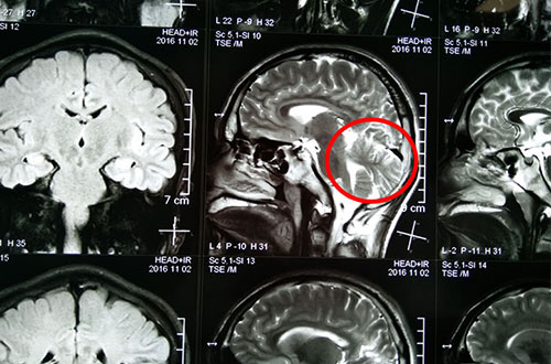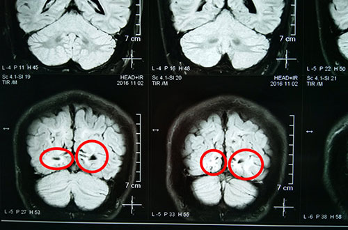 11月2日行MR头颅平扫+SWI,灰白质对比成像示:双侧枕叶异常信号伴脑白质量减少。