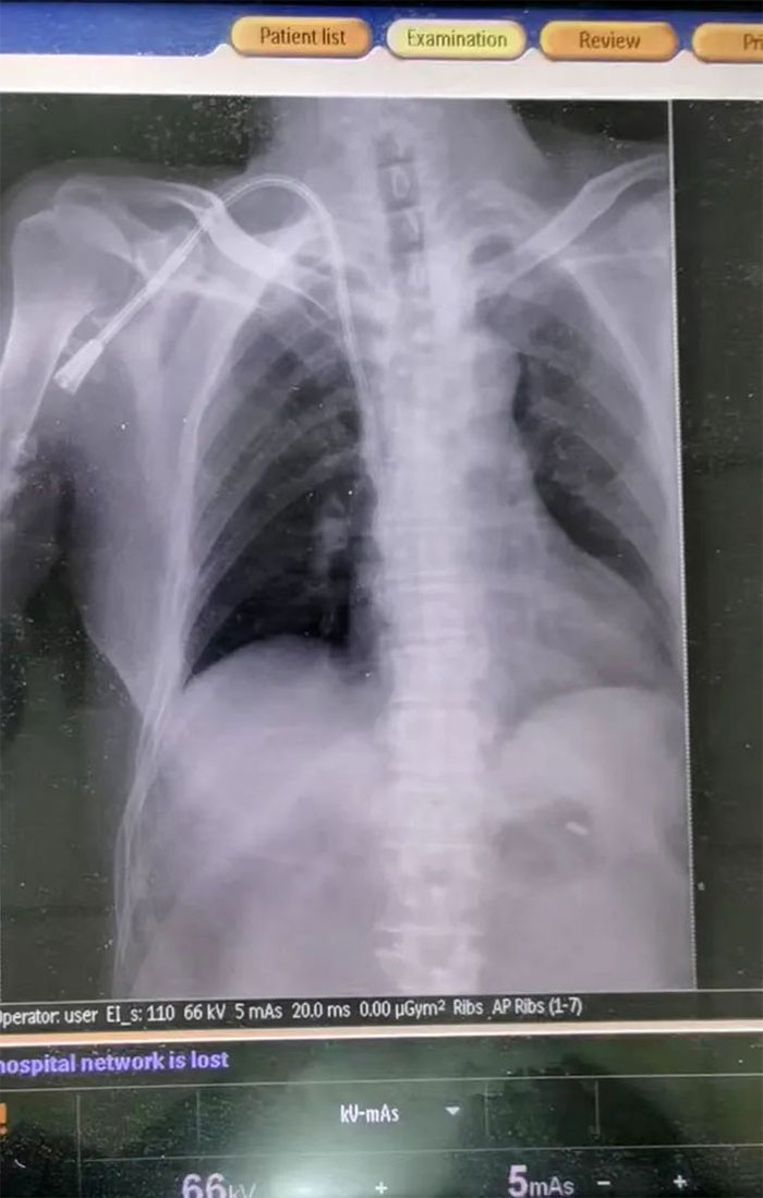 情况紧急,必须尽快为患者重新构建一条长期透析血管通路。为拯救患者,经医护团队反复讨论,与患者家属充分沟通病情后,决定为患者行右锁骨下静脉长期导管置入术。在张庆成主任、李向明医生及医护团队通力协作下,最终成功为该患者建立“生命通道”,架起生命桥梁。再经过DR验证,导管已经到达指定部位,未出现出血等相关并发症及静脉阻塞症状,术后导管引血通畅,血液透析、输血顺利进行。