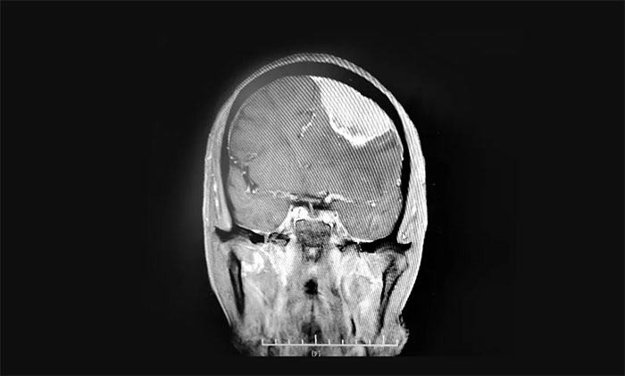 入院检查,头颅MRI提示:左侧额叶大脑凸面可见巨大团块状异常信号,周围可见明显水肿信号,胼胝体明显肿胀,临近左侧脑室受压向右侧移位,中线结构轻度右移,病灶大小约7.2×3.3×3.2cm。