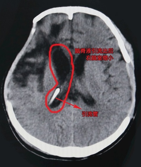 侯主任查看病人颅脑CT后发现,病人脑积水有增多的迹象,若不尽快手术引流,会导致脑室增大进而影响病人伤情恢复。征求病人家属同意后,侯主任于11月13日下午为患者行脑室-腹腔分流术。