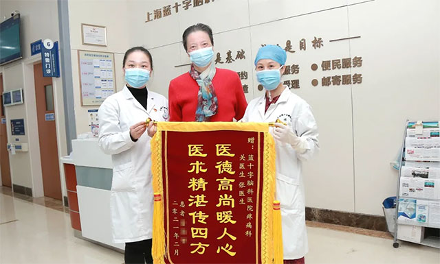 2月26日元宵节当天,68岁的乔阿姨(化名)在上海蓝十字脑科医院疼痛科接受治疗后,感激万分地说道。同时,她和家人一起,为关桂春教授和治疗师张陶送上了“医德高尚暖人心 医术精湛传四方”的锦旗,表达最诚挚的谢意。