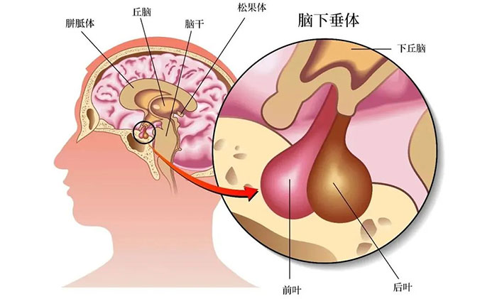 垂体是内分泌系统的主要控制者,位于大脑底部蝶骨上马鞍形的小窝内,仅有豌豆大小,负责控制人体内总体激素的平衡。垂体附着在下丘脑上,下丘脑是大脑的功能部分,又控制着垂体。