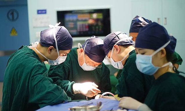 李士其教授在吴治群博士及医护团队协助下,处之泰然、游刃有余,避开回流静脉等重要血管及重要脑功能区,双极电凝切断肿物与大脑镰血供并分离。切开肿物包膜,包膜内肿物质地较软,耐心地行瘤内分块切除,在充分保护神经血管组织基础上,快速准确地止住一个个出血点,直至完整切除全部肿物。与术前预判相符,术中切除肿瘤后,术区脑组织肿胀较明显,行去骨瓣减压……医疗团队历时约8个小时,成功为患者切除5公分大肿瘤。术后,患者生命体征平稳,送入ICU(重症监护室)。