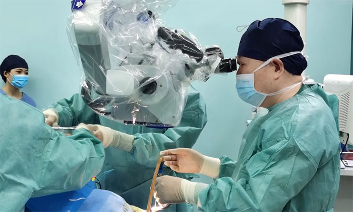 3月1日,经过充分的术前准备,并征得家属同意后,李士其教授正式为刘奶奶行经眉弓眶上锁孔手术。凭借娴熟的显微外科手术技巧,丰富的手术经验,熟练的显微神经解剖,在充分保护好海绵窦、颈内动脉、视神经等结构前提下,李士其教授在错综复杂的神经血管狭窄间隙中,逐步分块切除肿物,仔细刮除肿瘤,最终将肿瘤全部切除,手术顺利完成。