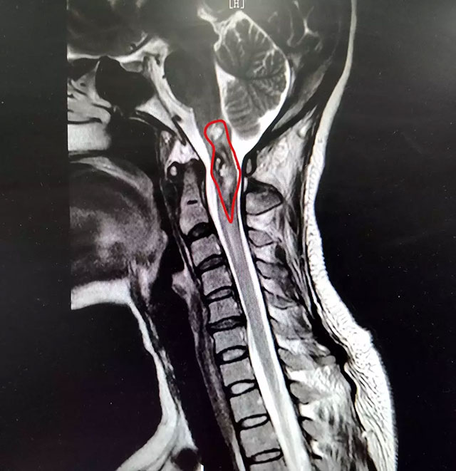 丈夫意识到爱妻这次的病情并不简单,放下手头的活从外地赶回来,和家人一起将姜女士送到杭州。医院CT报告提示,姜女士延髓颈髓占位伴出血,还伴有脊髓空洞症。