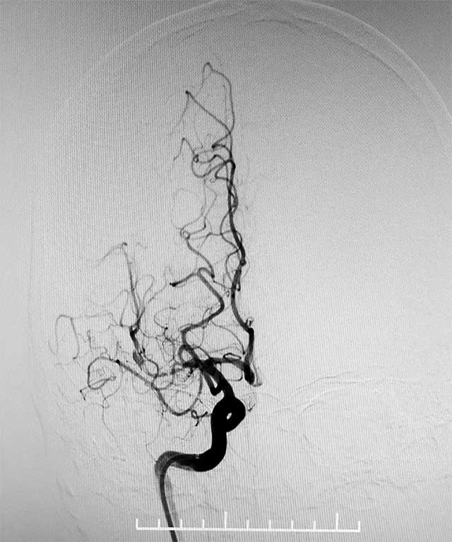 ▲ 术前造影显示,右侧大脑中动脉M1段闭塞