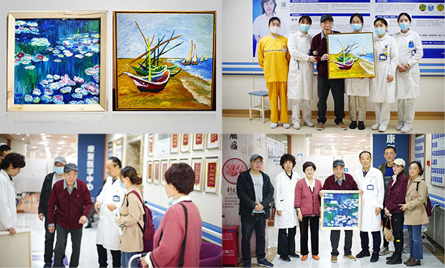▲ 4月17日上午父亲康复出院,弟弟特意画了油画代表锦旗感谢蓝十字医护人员——技艺精湛,医者仁心,莲花绽放,一帆风顺