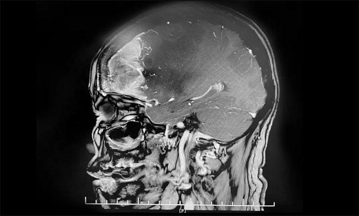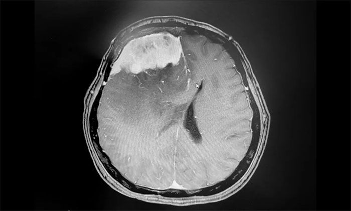 入院后,于耀宇主任为章女士完善检查。头颅MRI增强示:右侧额叶不规则团块状异常信号影,边界不清,最大直径约5.6cm,大小与鸭蛋相仿。病灶周边有大片水肿信号影;邻近大脑脚、胼胝体及双侧侧脑室受压、变形;中线结构左偏。