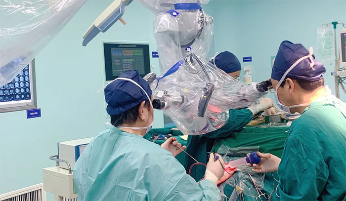 神经外科团队按照预定方案,在蔡司显微镜(双荧光)辅助下,充分显露肿瘤边界后,仔细分离肿物周边密集的神经血管,逐步分块切除肿物及附着的硬膜。在确保重要功能组织和动脉不受损害的前提下,经过6个小时的艰苦奋战,终于将肿瘤予以全切,同时完整地保留了重要的神经血管结构。