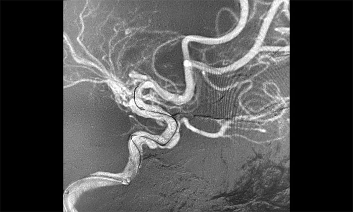 接下来,左颈内动脉海绵窦段、床突段多发动脉瘤处理极具挑战。由于C5、C6、C7段血管极度迂回曲折,类似“N”形,从C4、C5到C6之间的血管约成45°锐角,从C6至C7之间又是约30°锐角,可谓“山路十八弯”,而导丝又是极软,每向前推进一毫米,都非常艰难。这种介入手术对术者的技术要求非常高,如果支架贴合不好,打开不良,还需要用导丝蠕动“按摩”,让支架重新回到血管壁上。