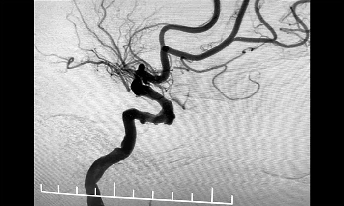 入院后,脑血管造影检查确诊:左颈内动脉海绵窦段、床突段多发动脉瘤,同时左颈内动脉起始段重度狭窄,眼动脉段狭窄,左大脑中动脉M1段闭塞。席刚明教授指出,从治疗的原则上这两种疾病是相互排斥的,血管狭窄的治疗需要进行单抗甚至双抗的一级卒中预防,也就是抗血小板治疗;而动脉瘤的治疗不能进行抗血小板治疗,因为一旦动脉瘤破裂,之前的抗血小板治疗会起到相反的作用,造成出血增加,所以治疗便成了一个“复杂”而又“棘手”的问题。