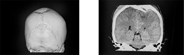▲ CT影像显示,小宝顶骨大块凹陷性骨折,脑顶叶皮层受压