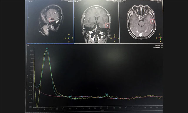 ▲ 患者病灶位于左侧颞叶,其波谱图显示异常