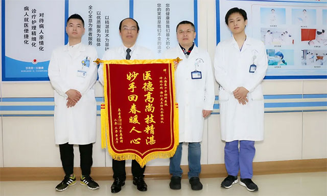 看到又逃过一劫并恢复意识的老伴,曹先生感动不已,将写着“医德高尚技精湛,妙手回春暖人心”字样的锦旗,亲自送到潘仁龙主任与吴治群博士办公室。