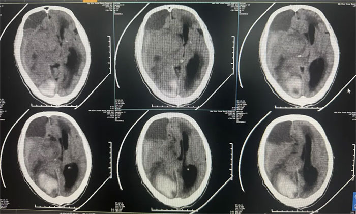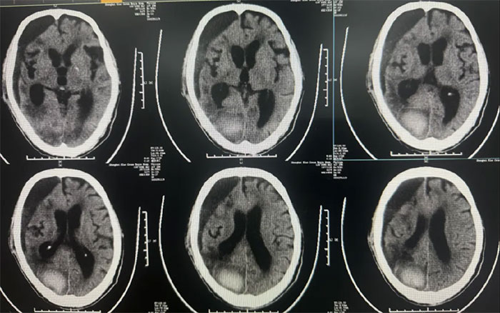 14天前突发神志不清,外院查头颅CT提示“脑出血,脑疝形成”。未手术,予脱水降颅压等保守治疗。