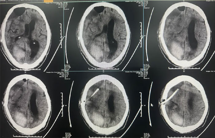 ● 硬膜下血肿引流15天后拔管,中线基本复位,硬膜下血肿较前明显减少;
