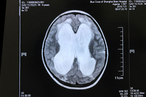 亮亮术前的磁共振影像显示:重度脑积水伴间质性脑水肿