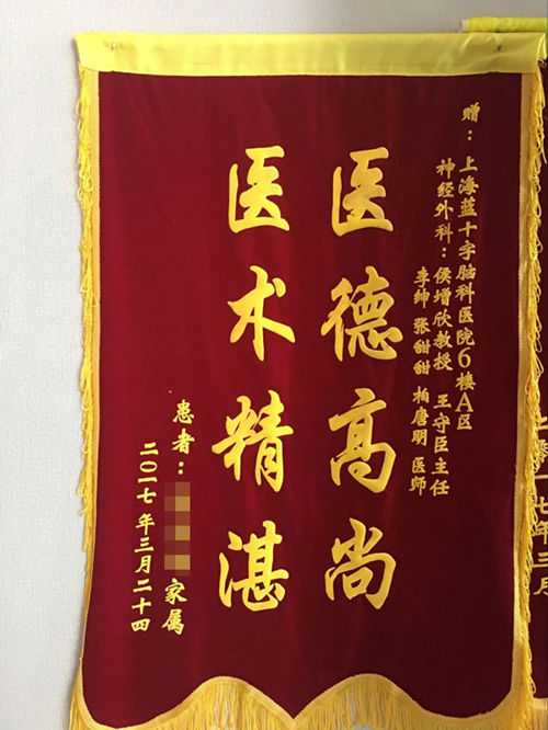 亮亮父母给侯增欣主任赠送的锦旗已挂在了锦旗墙